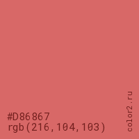 Цвет #D86867 в цветовой модели RGB обозначается тремя октетами (216, 104, 103) в десятичном формате и #D86867 в шестнадцатиричном (hex) формате, которые являются интенсивностью красного 216 (hex D8), интенсивность зелёного 104 (hex 68) и интенсивность синего 103 (hex 67).