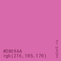 Цвет #D869AA в цветовой модели RGB обозначается тремя октетами (216, 105, 170) в десятичном формате и #D869AA в шестнадцатиричном (hex) формате, которые являются интенсивностью красного 216 (hex D8), интенсивность зелёного 105 (hex 69) и интенсивность синего 170 (hex AA).