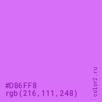 Цвет #D86FF8 в цветовой модели RGB обозначается тремя октетами (216, 111, 248) в десятичном формате и #D86FF8 в шестнадцатиричном (hex) формате, которые являются интенсивностью красного 216 (hex D8), интенсивность зелёного 111 (hex 6F) и интенсивность синего 248 (hex F8).