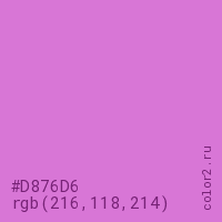 Цвет #D876D6 в цветовой модели RGB обозначается тремя октетами (216, 118, 214) в десятичном формате и #D876D6 в шестнадцатиричном (hex) формате, которые являются интенсивностью красного 216 (hex D8), интенсивность зелёного 118 (hex 76) и интенсивность синего 214 (hex D6).