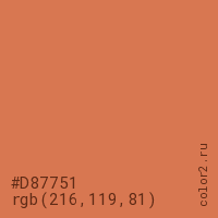 Цвет #D87751 в цветовой модели RGB обозначается тремя октетами (216, 119, 81) в десятичном формате и #D87751 в шестнадцатиричном (hex) формате, которые являются интенсивностью красного 216 (hex D8), интенсивность зелёного 119 (hex 77) и интенсивность синего 81 (hex 51).
