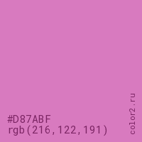 Цвет #D87ABF в цветовой модели RGB обозначается тремя октетами (216, 122, 191) в десятичном формате и #D87ABF в шестнадцатиричном (hex) формате, которые являются интенсивностью красного 216 (hex D8), интенсивность зелёного 122 (hex 7A) и интенсивность синего 191 (hex BF).