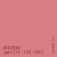 Цвет #D87D82 в цветовой модели RGB обозначается тремя октетами (216, 125, 130) в десятичном формате и #D87D82 в шестнадцатиричном (hex) формате, которые являются интенсивностью красного 216 (hex D8), интенсивность зелёного 125 (hex 7D) и интенсивность синего 130 (hex 82).