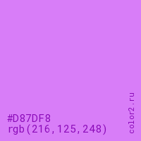 Цвет #D87DF8 в цветовой модели RGB обозначается тремя октетами (216, 125, 248) в десятичном формате и #D87DF8 в шестнадцатиричном (hex) формате, которые являются интенсивностью красного 216 (hex D8), интенсивность зелёного 125 (hex 7D) и интенсивность синего 248 (hex F8).