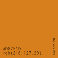 Цвет #D87F1D в цветовой модели RGB обозначается тремя октетами (216, 127, 29) в десятичном формате и #D87F1D в шестнадцатиричном (hex) формате, которые являются интенсивностью красного 216 (hex D8), интенсивность зелёного 127 (hex 7F) и интенсивность синего 29 (hex 1D).