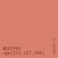 Цвет #D87F6D в цветовой модели RGB обозначается тремя октетами (216, 127, 109) в десятичном формате и #D87F6D в шестнадцатиричном (hex) формате, которые являются интенсивностью красного 216 (hex D8), интенсивность зелёного 127 (hex 7F) и интенсивность синего 109 (hex 6D).