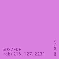 Цвет #D87FDF в цветовой модели RGB обозначается тремя октетами (216, 127, 223) в десятичном формате и #D87FDF в шестнадцатиричном (hex) формате, которые являются интенсивностью красного 216 (hex D8), интенсивность зелёного 127 (hex 7F) и интенсивность синего 223 (hex DF).