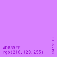 Цвет #D880FF в цветовой модели RGB обозначается тремя октетами (216, 128, 255) в десятичном формате и #D880FF в шестнадцатиричном (hex) формате, которые являются интенсивностью красного 216 (hex D8), интенсивность зелёного 128 (hex 80) и интенсивность синего 255 (hex FF).