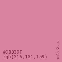 Цвет #D8839F в цветовой модели RGB обозначается тремя октетами (216, 131, 159) в десятичном формате и #D8839F в шестнадцатиричном (hex) формате, которые являются интенсивностью красного 216 (hex D8), интенсивность зелёного 131 (hex 83) и интенсивность синего 159 (hex 9F).