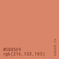 Цвет #D88569 в цветовой модели RGB обозначается тремя октетами (216, 133, 105) в десятичном формате и #D88569 в шестнадцатиричном (hex) формате, которые являются интенсивностью красного 216 (hex D8), интенсивность зелёного 133 (hex 85) и интенсивность синего 105 (hex 69).