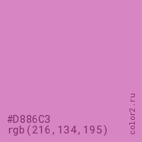 Цвет #D886C3 в цветовой модели RGB обозначается тремя октетами (216, 134, 195) в десятичном формате и #D886C3 в шестнадцатиричном (hex) формате, которые являются интенсивностью красного 216 (hex D8), интенсивность зелёного 134 (hex 86) и интенсивность синего 195 (hex C3).