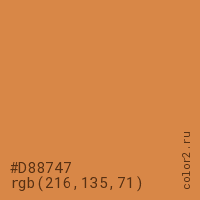 Цвет #D88747 в цветовой модели RGB обозначается тремя октетами (216, 135, 71) в десятичном формате и #D88747 в шестнадцатиричном (hex) формате, которые являются интенсивностью красного 216 (hex D8), интенсивность зелёного 135 (hex 87) и интенсивность синего 71 (hex 47).