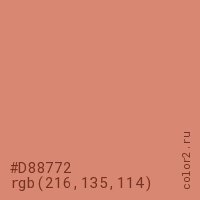 Цвет #D88772 в цветовой модели RGB обозначается тремя октетами (216, 135, 114) в десятичном формате и #D88772 в шестнадцатиричном (hex) формате, которые являются интенсивностью красного 216 (hex D8), интенсивность зелёного 135 (hex 87) и интенсивность синего 114 (hex 72).