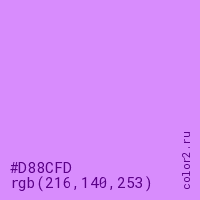 Цвет #D88CFD в цветовой модели RGB обозначается тремя октетами (216, 140, 253) в десятичном формате и #D88CFD в шестнадцатиричном (hex) формате, которые являются интенсивностью красного 216 (hex D8), интенсивность зелёного 140 (hex 8C) и интенсивность синего 253 (hex FD).