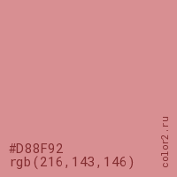 Цвет #D88F92 в цветовой модели RGB обозначается тремя октетами (216, 143, 146) в десятичном формате и #D88F92 в шестнадцатиричном (hex) формате, которые являются интенсивностью красного 216 (hex D8), интенсивность зелёного 143 (hex 8F) и интенсивность синего 146 (hex 92).