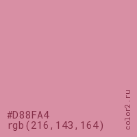 Цвет #D88FA4 в цветовой модели RGB обозначается тремя октетами (216, 143, 164) в десятичном формате и #D88FA4 в шестнадцатиричном (hex) формате, которые являются интенсивностью красного 216 (hex D8), интенсивность зелёного 143 (hex 8F) и интенсивность синего 164 (hex A4).