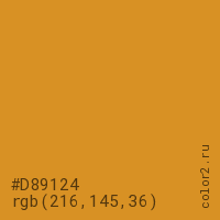Цвет #D89124 в цветовой модели RGB обозначается тремя октетами (216, 145, 36) в десятичном формате и #D89124 в шестнадцатиричном (hex) формате, которые являются интенсивностью красного 216 (hex D8), интенсивность зелёного 145 (hex 91) и интенсивность синего 36 (hex 24).