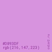 Цвет #D893DF в цветовой модели RGB обозначается тремя октетами (216, 147, 223) в десятичном формате и #D893DF в шестнадцатиричном (hex) формате, которые являются интенсивностью красного 216 (hex D8), интенсивность зелёного 147 (hex 93) и интенсивность синего 223 (hex DF).