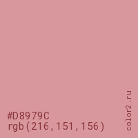 Цвет #D8979C в цветовой модели RGB обозначается тремя октетами (216, 151, 156) в десятичном формате и #D8979C в шестнадцатиричном (hex) формате, которые являются интенсивностью красного 216 (hex D8), интенсивность зелёного 151 (hex 97) и интенсивность синего 156 (hex 9C).