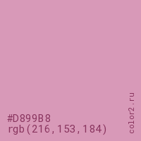 Цвет #D899B8 в цветовой модели RGB обозначается тремя октетами (216, 153, 184) в десятичном формате и #D899B8 в шестнадцатиричном (hex) формате, которые являются интенсивностью красного 216 (hex D8), интенсивность зелёного 153 (hex 99) и интенсивность синего 184 (hex B8).