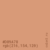 Цвет #D89A78 в цветовой модели RGB обозначается тремя октетами (216, 154, 120) в десятичном формате и #D89A78 в шестнадцатиричном (hex) формате, которые являются интенсивностью красного 216 (hex D8), интенсивность зелёного 154 (hex 9A) и интенсивность синего 120 (hex 78).