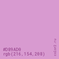 Цвет #D89AD0 в цветовой модели RGB обозначается тремя октетами (216, 154, 208) в десятичном формате и #D89AD0 в шестнадцатиричном (hex) формате, которые являются интенсивностью красного 216 (hex D8), интенсивность зелёного 154 (hex 9A) и интенсивность синего 208 (hex D0).
