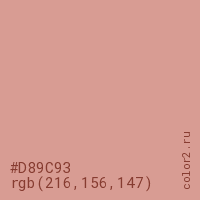 Цвет #D89C93 в цветовой модели RGB обозначается тремя октетами (216, 156, 147) в десятичном формате и #D89C93 в шестнадцатиричном (hex) формате, которые являются интенсивностью красного 216 (hex D8), интенсивность зелёного 156 (hex 9C) и интенсивность синего 147 (hex 93).