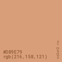 Цвет #D89E79 в цветовой модели RGB обозначается тремя октетами (216, 158, 121) в десятичном формате и #D89E79 в шестнадцатиричном (hex) формате, которые являются интенсивностью красного 216 (hex D8), интенсивность зелёного 158 (hex 9E) и интенсивность синего 121 (hex 79).