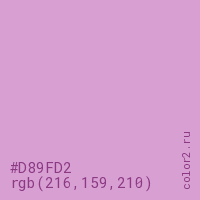 Цвет #D89FD2 в цветовой модели RGB обозначается тремя октетами (216, 159, 210) в десятичном формате и #D89FD2 в шестнадцатиричном (hex) формате, которые являются интенсивностью красного 216 (hex D8), интенсивность зелёного 159 (hex 9F) и интенсивность синего 210 (hex D2).