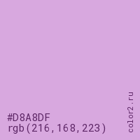 Цвет #D8A8DF в цветовой модели RGB обозначается тремя октетами (216, 168, 223) в десятичном формате и #D8A8DF в шестнадцатиричном (hex) формате, которые являются интенсивностью красного 216 (hex D8), интенсивность зелёного 168 (hex A8) и интенсивность синего 223 (hex DF).