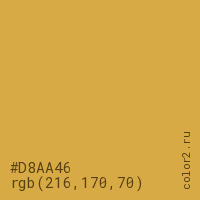 Цвет #D8AA46 в цветовой модели RGB обозначается тремя октетами (216, 170, 70) в десятичном формате и #D8AA46 в шестнадцатиричном (hex) формате, которые являются интенсивностью красного 216 (hex D8), интенсивность зелёного 170 (hex AA) и интенсивность синего 70 (hex 46).