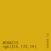 Цвет #D8AC13 в цветовой модели RGB обозначается тремя октетами (216, 172, 19) в десятичном формате и #D8AC13 в шестнадцатиричном (hex) формате, которые являются интенсивностью красного 216 (hex D8), интенсивность зелёного 172 (hex AC) и интенсивность синего 19 (hex 13).