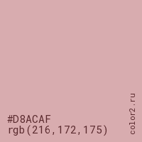 Цвет #D8ACAF в цветовой модели RGB обозначается тремя октетами (216, 172, 175) в десятичном формате и #D8ACAF в шестнадцатиричном (hex) формате, которые являются интенсивностью красного 216 (hex D8), интенсивность зелёного 172 (hex AC) и интенсивность синего 175 (hex AF).