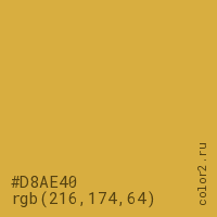 Цвет #D8AE40 в цветовой модели RGB обозначается тремя октетами (216, 174, 64) в десятичном формате и #D8AE40 в шестнадцатиричном (hex) формате, которые являются интенсивностью красного 216 (hex D8), интенсивность зелёного 174 (hex AE) и интенсивность синего 64 (hex 40).