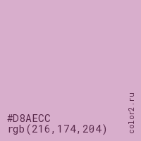 Цвет #D8AECC в цветовой модели RGB обозначается тремя октетами (216, 174, 204) в десятичном формате и #D8AECC в шестнадцатиричном (hex) формате, которые являются интенсивностью красного 216 (hex D8), интенсивность зелёного 174 (hex AE) и интенсивность синего 204 (hex CC).