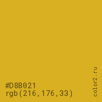 Цвет #D8B021 в цветовой модели RGB обозначается тремя октетами (216, 176, 33) в десятичном формате и #D8B021 в шестнадцатиричном (hex) формате, которые являются интенсивностью красного 216 (hex D8), интенсивность зелёного 176 (hex B0) и интенсивность синего 33 (hex 21).