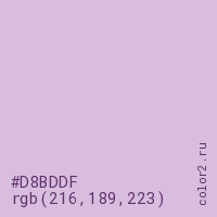 Цвет #D8BDDF в цветовой модели RGB обозначается тремя октетами (216, 189, 223) в десятичном формате и #D8BDDF в шестнадцатиричном (hex) формате, которые являются интенсивностью красного 216 (hex D8), интенсивность зелёного 189 (hex BD) и интенсивность синего 223 (hex DF).