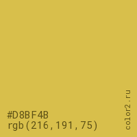 Цвет #D8BF4B в цветовой модели RGB обозначается тремя октетами (216, 191, 75) в десятичном формате и #D8BF4B в шестнадцатиричном (hex) формате, которые являются интенсивностью красного 216 (hex D8), интенсивность зелёного 191 (hex BF) и интенсивность синего 75 (hex 4B).