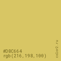 Цвет #D8C664 в цветовой модели RGB обозначается тремя октетами (216, 198, 100) в десятичном формате и #D8C664 в шестнадцатиричном (hex) формате, которые являются интенсивностью красного 216 (hex D8), интенсивность зелёного 198 (hex C6) и интенсивность синего 100 (hex 64).
