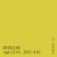 Цвет #D8CD40 в цветовой модели RGB обозначается тремя октетами (216, 205, 64) в десятичном формате и #D8CD40 в шестнадцатиричном (hex) формате, которые являются интенсивностью красного 216 (hex D8), интенсивность зелёного 205 (hex CD) и интенсивность синего 64 (hex 40).