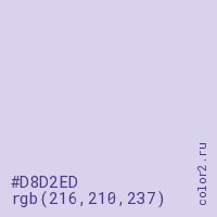 Цвет #D8D2ED в цветовой модели RGB обозначается тремя октетами (216, 210, 237) в десятичном формате и #D8D2ED в шестнадцатиричном (hex) формате, которые являются интенсивностью красного 216 (hex D8), интенсивность зелёного 210 (hex D2) и интенсивность синего 237 (hex ED).
