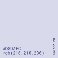 Цвет #D8DAEC в цветовой модели RGB обозначается тремя октетами (216, 218, 236) в десятичном формате и #D8DAEC в шестнадцатиричном (hex) формате, которые являются интенсивностью красного 216 (hex D8), интенсивность зелёного 218 (hex DA) и интенсивность синего 236 (hex EC).