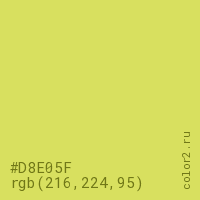 Цвет #D8E05F в цветовой модели RGB обозначается тремя октетами (216, 224, 95) в десятичном формате и #D8E05F в шестнадцатиричном (hex) формате, которые являются интенсивностью красного 216 (hex D8), интенсивность зелёного 224 (hex E0) и интенсивность синего 95 (hex 5F).