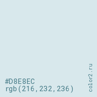 Цвет #D8E8EC в цветовой модели RGB обозначается тремя октетами (216, 232, 236) в десятичном формате и #D8E8EC в шестнадцатиричном (hex) формате, которые являются интенсивностью красного 216 (hex D8), интенсивность зелёного 232 (hex E8) и интенсивность синего 236 (hex EC).