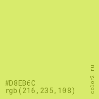 Цвет #D8EB6C в цветовой модели RGB обозначается тремя октетами (216, 235, 108) в десятичном формате и #D8EB6C в шестнадцатиричном (hex) формате, которые являются интенсивностью красного 216 (hex D8), интенсивность зелёного 235 (hex EB) и интенсивность синего 108 (hex 6C).
