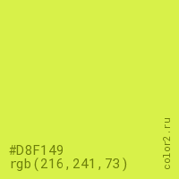 Цвет #D8F149 в цветовой модели RGB обозначается тремя октетами (216, 241, 73) в десятичном формате и #D8F149 в шестнадцатиричном (hex) формате, которые являются интенсивностью красного 216 (hex D8), интенсивность зелёного 241 (hex F1) и интенсивность синего 73 (hex 49).