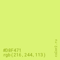 Цвет #D8F471 в цветовой модели RGB обозначается тремя октетами (216, 244, 113) в десятичном формате и #D8F471 в шестнадцатиричном (hex) формате, которые являются интенсивностью красного 216 (hex D8), интенсивность зелёного 244 (hex F4) и интенсивность синего 113 (hex 71).
