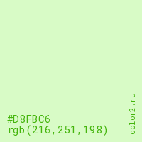 Цвет #D8FBC6 в цветовой модели RGB обозначается тремя октетами (216, 251, 198) в десятичном формате и #D8FBC6 в шестнадцатиричном (hex) формате, которые являются интенсивностью красного 216 (hex D8), интенсивность зелёного 251 (hex FB) и интенсивность синего 198 (hex C6).