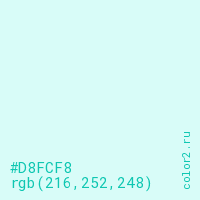 Цвет #D8FCF8 в цветовой модели RGB обозначается тремя октетами (216, 252, 248) в десятичном формате и #D8FCF8 в шестнадцатиричном (hex) формате, которые являются интенсивностью красного 216 (hex D8), интенсивность зелёного 252 (hex FC) и интенсивность синего 248 (hex F8).