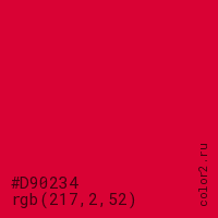 Цвет #D90234 в цветовой модели RGB обозначается тремя октетами (217, 2, 52) в десятичном формате и #D90234 в шестнадцатиричном (hex) формате, которые являются интенсивностью красного 217 (hex D9), интенсивность зелёного 2 (hex 02) и интенсивность синего 52 (hex 34).